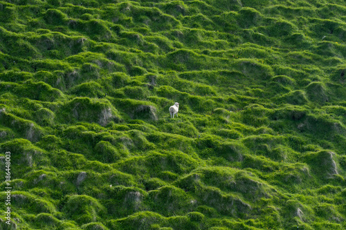 Einzelnes isoliertes Schaf auf sehr grünem Abhang