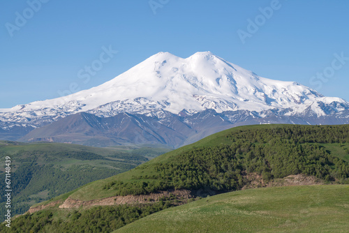 Elbrus Mount in the morning June landscape. Kabardino-Balkaria, Russia