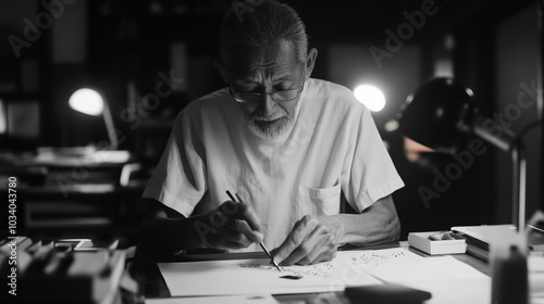 artist, elderly, drawing, design, studio, evening, creativity, concentration, paper, desk, warm, lighting, intricate, pattern, artistry, calmness, craftsman, tool, workspace, inspiration, detailed, work, expression, age, passion, hobby, diligence, brush, illumination, environment, solitude, elegance, skill, craft, senior, man, office, hand-made, sharpened, visual, art, quiet, serene, traditional, art, reflective, ambient, light, master