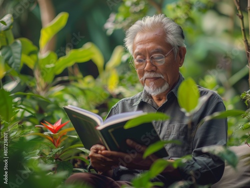 Elderly Asian Businessman Reading About Green Investments in Serene Garden