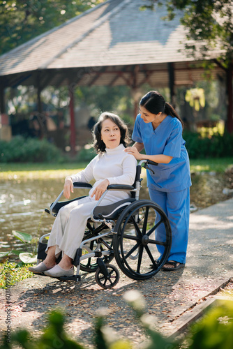 Elderly asian senior woman on wheelchair with careful caregiver and encourage patient, walking in garden. with care from a caregiver and senior health insurance..
