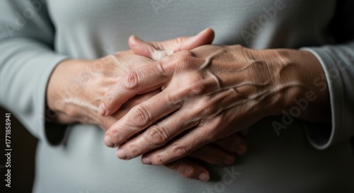 Elderly caucasian male hands intertwined close-up with prominent veins