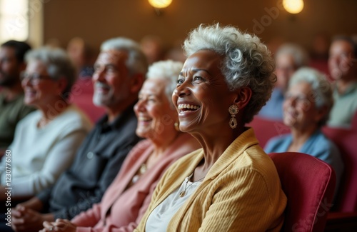 Elderly community members joyfully gathered in church. African American woman smiles happily in center. Friends, family surround. Positive atmosphere. Generational connection. Warm, loving