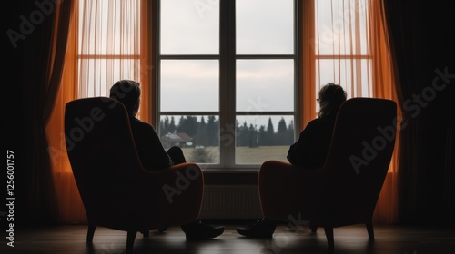 couple, elderly, sitting, contemplating, view, countryside, window, room, chair, older, people, senior, retirement, home, landscape, nature, life, relaxation, peace, calm, serene, quiet, tranquil, stillness, solitude, thoughtful, contemplative, mature, adult, togetherness, love, companionship, bond, human relationships, family, friendship, happiness, contentment, age, wisdom, life events, retirement home