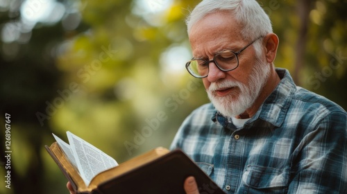 elderly, male, reading, book, outdoors, nature, peaceful, serene, goggles, beard, mature, tree, wisdom, thoughtful, study, learning, sharpened, concentration, plaid, shirt, relaxation, leisure, tranquil, page, cognition, educating, retirement, literature, hobby, greenery, sunlight, day, contemplation, solitude, intellectual, parchment, routine, lifestyle, calmness, mindfulness