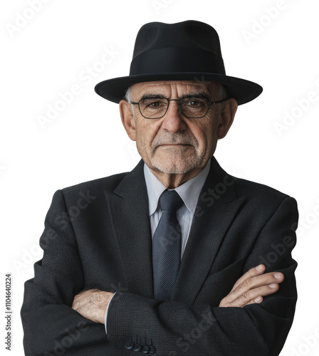 elderly, man, suit, hat, portrait, arm, crossed, serious, expression, confidence, wisdom, black, goggles, standing, confident, character, mature, style, fashion, dark, colours, formal, attire, composed, age, heritage, tradition, personality, dignity, handshake, business, modern, professional, senior, background, contrast, look, facial, feature, thoughtful, intelligent, poised, gesture, calm, sophistication, refinement