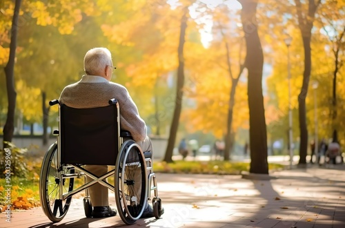 Elderly man in wheelchair enjoying outdoor park with trees and benches on a sunny day.