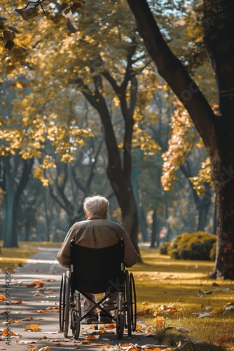 Elderly man sitting alone in a wheelchair in a park. Solitude and contemplation, highlighting the concept of loneliness and life during retirement.