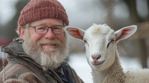 man, beard, white, goat, farmer, animal, elderly, hat, winter, brown, red, furry, sheep, goggles, nose, smile, face, eye, mouth, teeth, wool, fur, portrait, background, hair, skin, warm, happy, friendly, look, nature, cute, farm, farm animal, rural, country, domestic, human, mammal, pet, agriculture, countryside, soft, fluffy, companion, bond