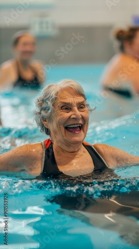 Elderly woman in a black swimsuit enjoys aquatic fitness in a pool, smiling and engaging with the camera, surrounded by others having a good time.