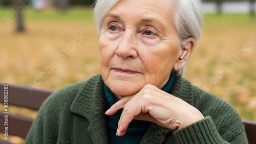elderly, woman, listening, music, bench, park, autumn, leaf, thoughtful, senior, casual attire, green, sweater, nature, leisure, calm, earphones, peaceful, relaxation, aged, sitting, fall, expressive, contemplating, active, life, joy, moment, enjoyment, intimate, leisure time, audio, quiet, serene, tree, connection, lifestyle, candid, season, contentment, renewal