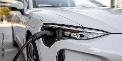 electric car, charging, car, vehicle, transportation, energy, technology, automotive, modern, power, environmentally friendly, battery, charger, cable, plug, mains outlet, station, eco, fuel, alternative, industry, environment, clean, sustainable, future, drive, automobile, white, detail, closeup, headlamp, port, design, innovation, urban, outdoors, lifestyle