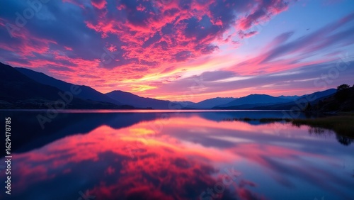 serene, surreal, peaceful, glowing, moody, vibrant, dramatic, magenta, scenery, silence, stillness, twilight, mirror, remote, dusk, pastel, dreamlike, horizon, calm, sunset, outdoors, sky, evening, water, nature, mountain, landscape, lake