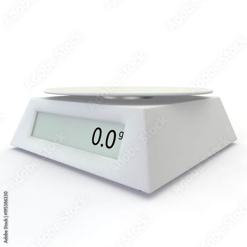 Electronic scales show 0 grams, on a white isolated background. There is a free space for your design