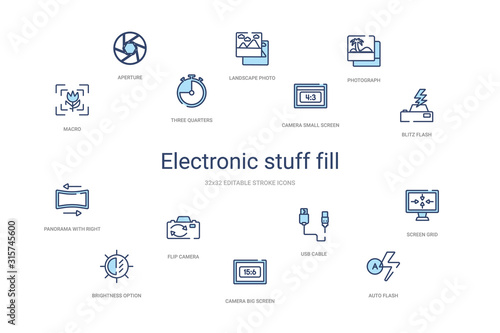 electronic stuff fill concept 14 colorful outline icons. 2 color blue stroke icons