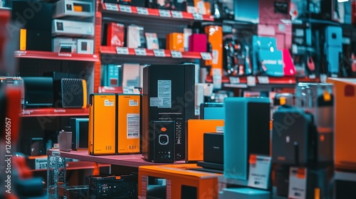 electronic, retail, store, display, device, box, technology, consumer, product, shelf, orange, black, blue, stacked, assortment, variety, selection, market, shop, sale, purchase, consumerism, modern, contemporary, colourful, vibrant, bright, compact, equipment, appliance, hardware, software, component, accessory, inventory, stock, warehouse, aisle, shopping, price, tags, label, information, detail