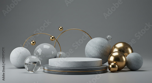 Elegant 3D Render of Spheres Podiums and Golden Arcs on Gray Background.