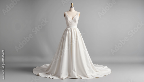Elegant A-line wedding dress with flowing train displayed on mannequin in a minimalist studio for bridal fashion showcase