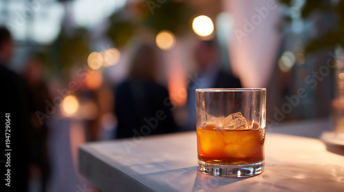 drink, beverage, alcohol, cocktail, spirit, glasses, tumbler, ice, cube, amber, brown, orange, bar, counter, table, party, event, social, gathering, celebration, night, evening, bokeh, light, blurred, background, people, relax, unwind, luxury, posh, sophisticated, lifestyle, refreshment, adult, pleasure, indulgence, serve, enjoy, cool, texture, detail, warm, festive