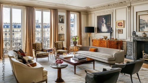 Elegant and Contemporary Living Room with Large Windows Offering City Views, Stylish Furniture, and Artistic Decor in a Luxurious Apartment Setting