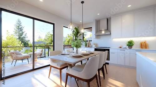 kitchen, interior, modern, dining, table, chair, furniture, room, design, decor, lighting, neutral, tone, minimalist, elegant, contemporary, architecture, home, living, space, cosy, warm, inviting, lifestyle, clean, bright, airy, render, three-dimensional, cooking, eat, dine, entertain, relax, family, meal, hospitality, domestic, comfortable, stylish, refined, luxury, aesthetic, chic