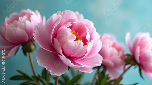 Elegant and vibrant pink peonies bloom against a serene, blue backdrop.