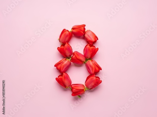 Elegant arrangement of red tulips in the shape of the number eight on a pink background. Perfect for International Women's Day greeting cards, spring holiday marketing and social media headers.