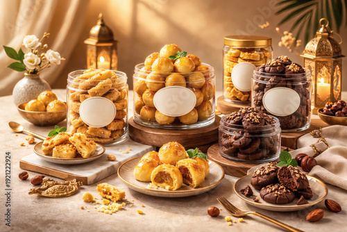 cookie, eid, ramadan, sweet, dessert, snack, traditional, festive, celebration, islamic, assortment, homemade, baked, pastry, confectionery, bakery, delicious, tasty, epicure, container, cardboard box, branding, label, blank, product, marketing, display, rustic, wooden, lantern, decoration, light, culture, muslim, holiday, hospitality, gathering, feast, sweet, still life, commercial, promotion, elegant, luxury