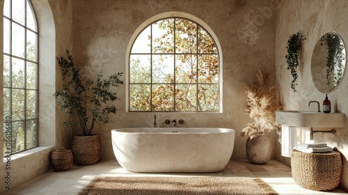 bathroom, tub, window, nature, decor, plant, sunlight, stone, texture, minimalist, furnishing, interior, design, cosy, relaxation, spa, aesthetic, warmth, modern, comfort, earthy, ambience, greenery, stylish, round, mirror, soft, tone, basket, linen, calmness, space, architecture, chic, serene, view, rustic, elegance, clean, simplicity, environment, natural, inviting, harmony, luxury, light, home, atmosphere