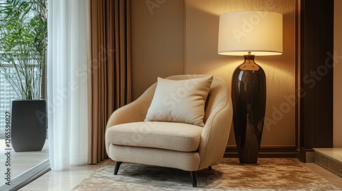 Elegant beige armchair and tall lamp create a cozy atmosphere