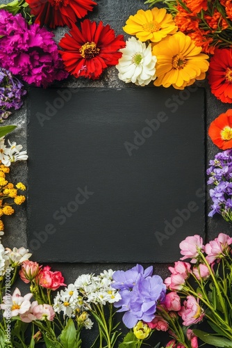 Elegant black canvas bordered by colorful spring flowers, leaving space for personalized messages. Flat lay.