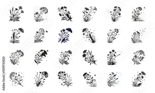 Elegant Black Silhouette Floral Designs: A Collection of Peony and Rose Botanical Vector Graphics for Tattoos, Logos, and Decorative Elements