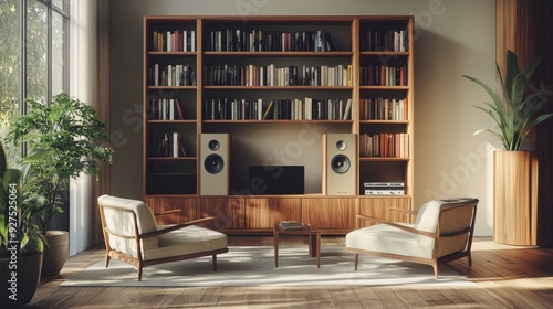 Elegant bookshelf with integrated audio speakers, captured in a 3D rendering. This setup emphasizes a refined design for enjoying music in a stylish home environment.