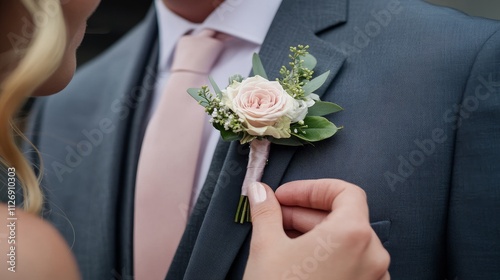 hand, placing, boutonniere, suit, lapel, detail, formal, wear, attire, elegance, accessory, wedding, groom, fashion, stylish, ceremony, celebration, special, occasion, floral, decoration, gentleman, dressing, event, flower, arrangement