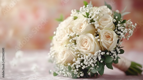 Elegant bridal bouquet, white roses, delicate baby's breath, satin ribbon wrap, soft pastel background, professional floral arrangement, crisp focus, romantic atmosphere, wedding day theme.