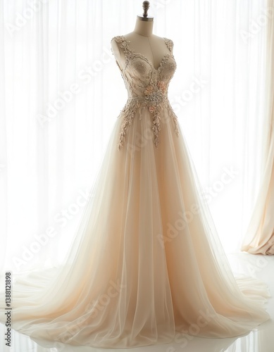 Elegant bridal gown, exquisite floral embellishments. Shimmering beads, timeless romantic look. Sophisticated design with tulle skirt, long train. Wedding dress on mannequin, fashion apparel. Perfect