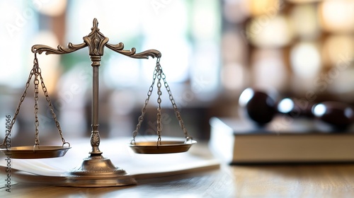 Elegant bronze scales of justice symbolizing law and fairness placed on a wooden desk in a professional setting : Generative AI