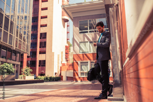 businessman, briefcase, street, leaning, portrait, watch, time, looking down, checking, perspective, low, sunlight, outdoors, city, urban, confident, background, suit, elegant, day, wall, building, architecture, modern, horizontal, photogenic, style, man, pensive, attractive, male, standing, beard, holding, 1, person, white, calm, coiffure, young, stylish, brunet, business, posing, elegance