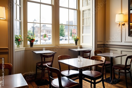 Elegant Cafe Interior with Vintage Chairs and Rectangular Tables by Bright Window