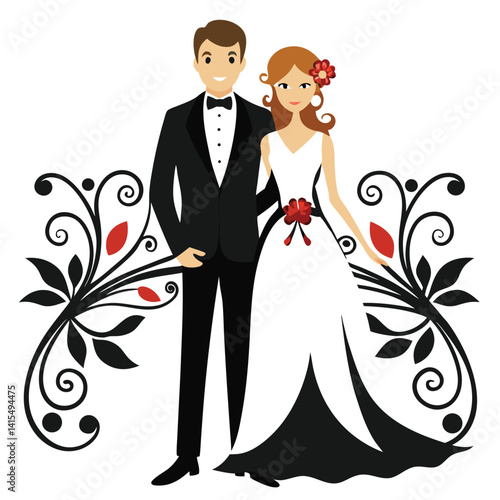 wedding, bride, groom, couple, marriage, married, cartoon, illustration, vector, graphic, design, art, elegant, stylish, formal, tuxedo, bridal gown, white dress, black suit, happy, love, romance, celebration, floral, swirl, ornament, decoration, red flower, black-and-white, simple, modern, minimal, icon, symbol, clip art, invitation, card
