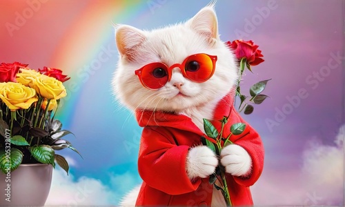 cat, elegant, sunglasses, tuxedo, rose, floral, cute, animal, fashion, stylish, adorable, fun, playful, vibrant, creative, visual, design, bright, bold, digital artwork, artistic, character, quirky, whimsical, fancy dress, felino, charming, captivating, dapper, romantic, colourful, red