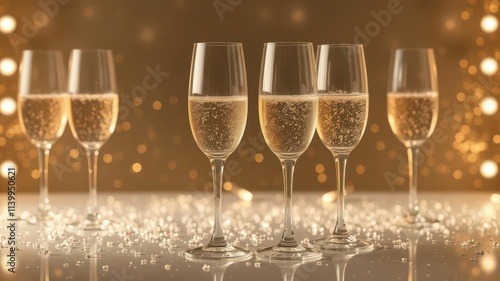 Elegant champagne flutes, bubbly liquid reflecting light, festive, design, celebration