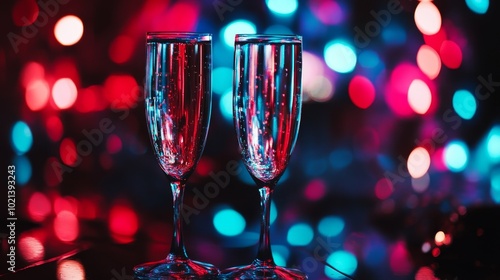 Elegant Champagne Glasses Sparkling Amidst Vibrant Bokeh Lights at a Festive Evening Celebration