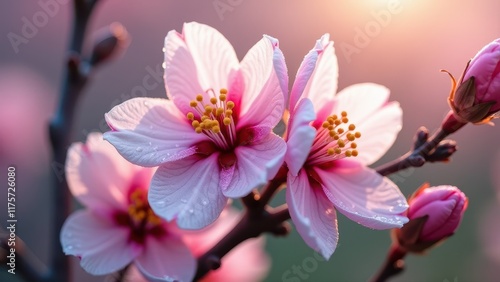 cherry blossom, flower, pink petals, dew-drop, blooming, spring, nature, closeup, beauty, calmness, serenity, soft light, sunset, natural, delicate, botany, garden, renewal, floral, plant, sunlight, peaceful, meditation, flower petals, magnolia, blossoming, landscape, photo, freshness, calmness, magnificent, sunlit, park, tree branch, awakening, life