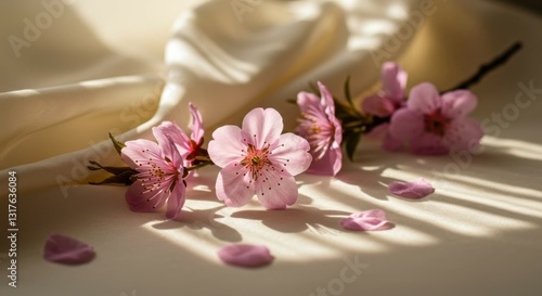 Elegant cherry blossoms scattered across a silk backdrop, glowing under the afternoon sun.
