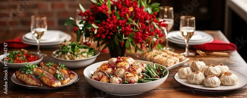 chinese, lunar, new year, new, year, table, set, attractively, arranged, food, decoration, celebration, festival, banquet, epicure, cookery, flower, glassware, dining, appetiser, main, dish, salad, vegetable, flavorful, bowl, plate, chopstick, hospitality, gathering, friends, family, occasion, event, tradition, premium, festive, decor, cheerful, colours, atmosphere
