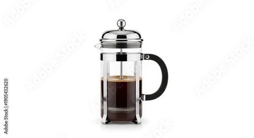 Elegant Chrome and Glass French Press Brewing Rich Coffee for a Perfect Morning Beverage Against a Clean White Background
