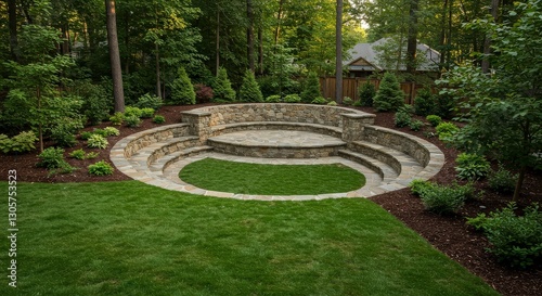 Elegant circular natural stone amphitheater surrounded by vibrant green lawn and lush dense forest trees, concept for outdoor event venue, garden design inspiration and landscape architecture
