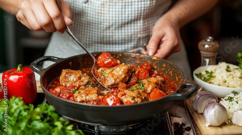 Elegant cooking action preparing a simple meal with fresh ingredients in a cozy kitchen environment