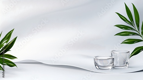 cosmetic, beauty, product, skincare, container, jar, bottle, glasses, white, background, green, leaf, plant, tropical, minimal, clean, simple, elegant, modern, luxury, texture, wave, smooth, soft, cream, serum, moisturiser, face, care, health, wellness, natural, organic, fresh, bright, pure, cleanse, hydrate, glow, radiant, youthful, tone, dermatology, cosmetology, spa, salon, presentation, display